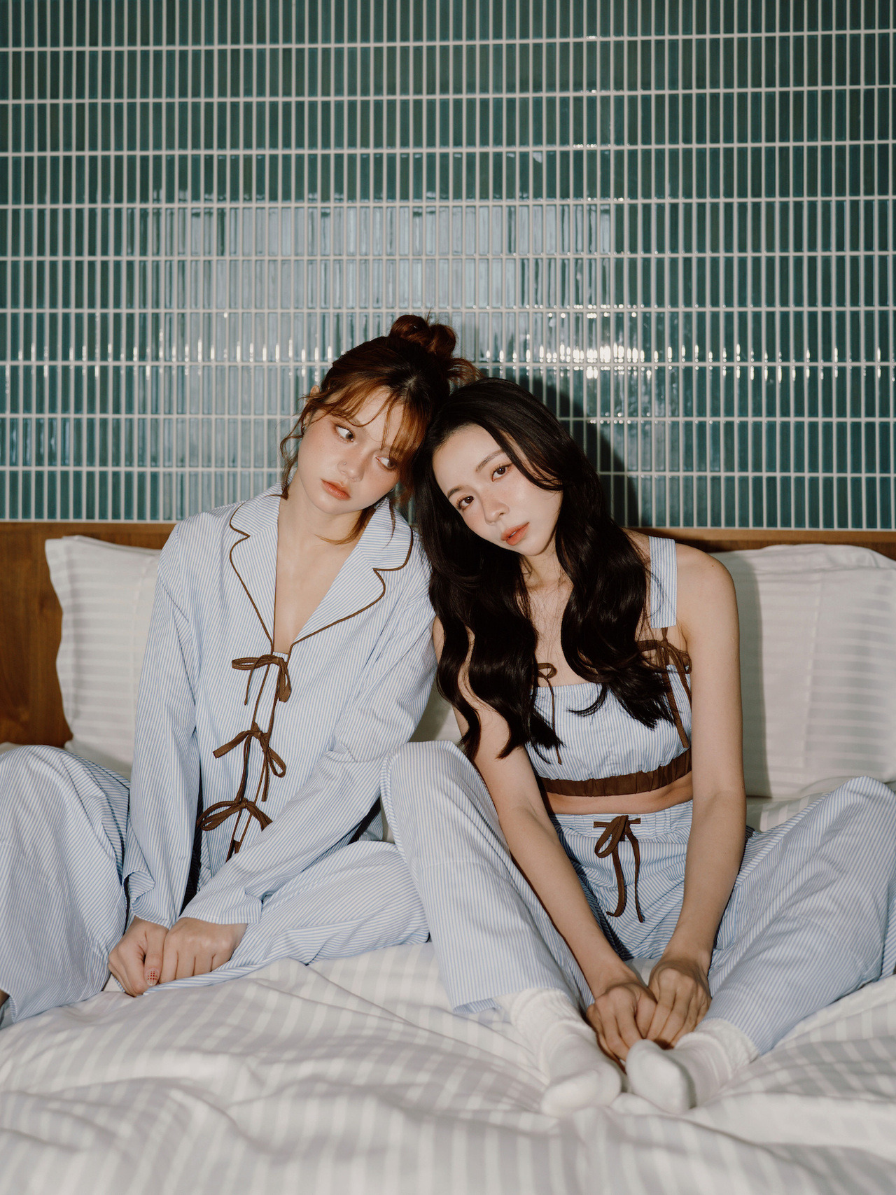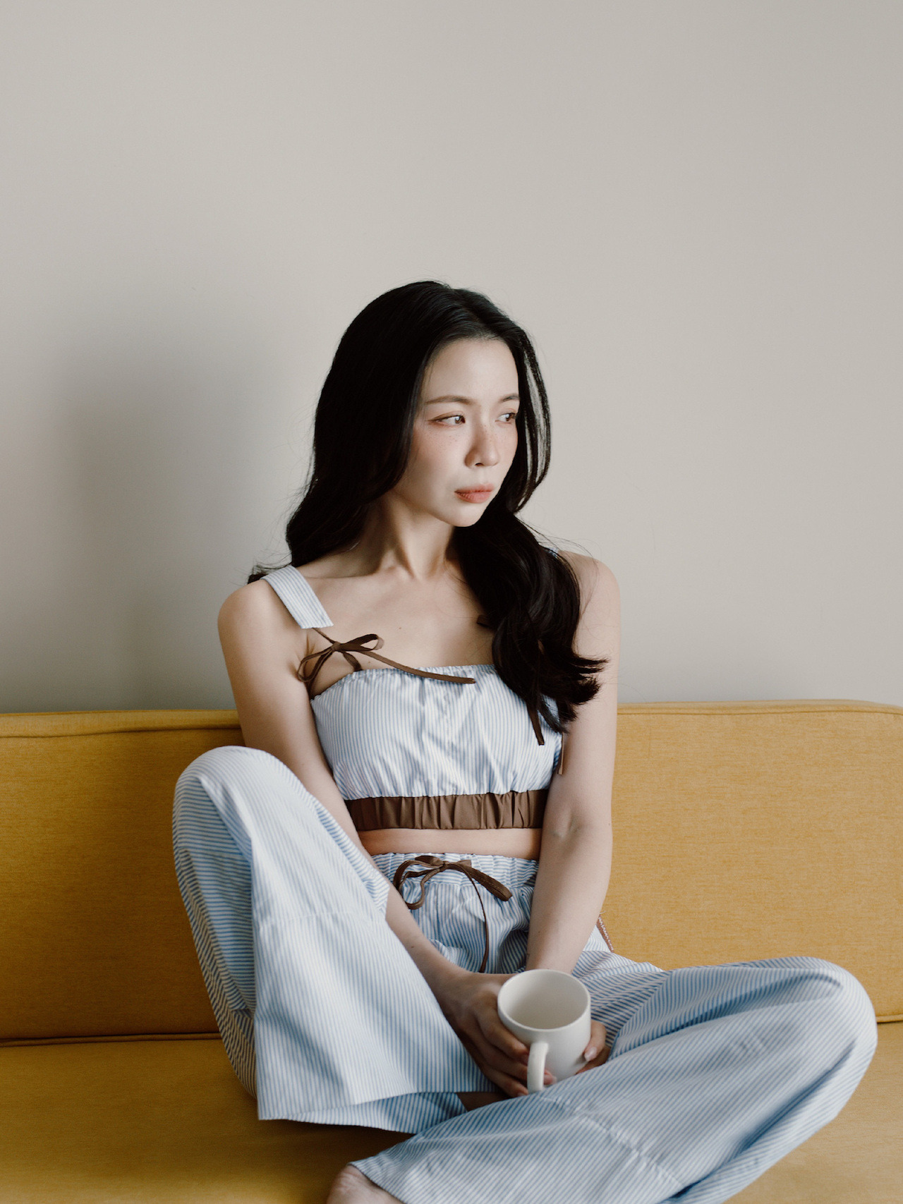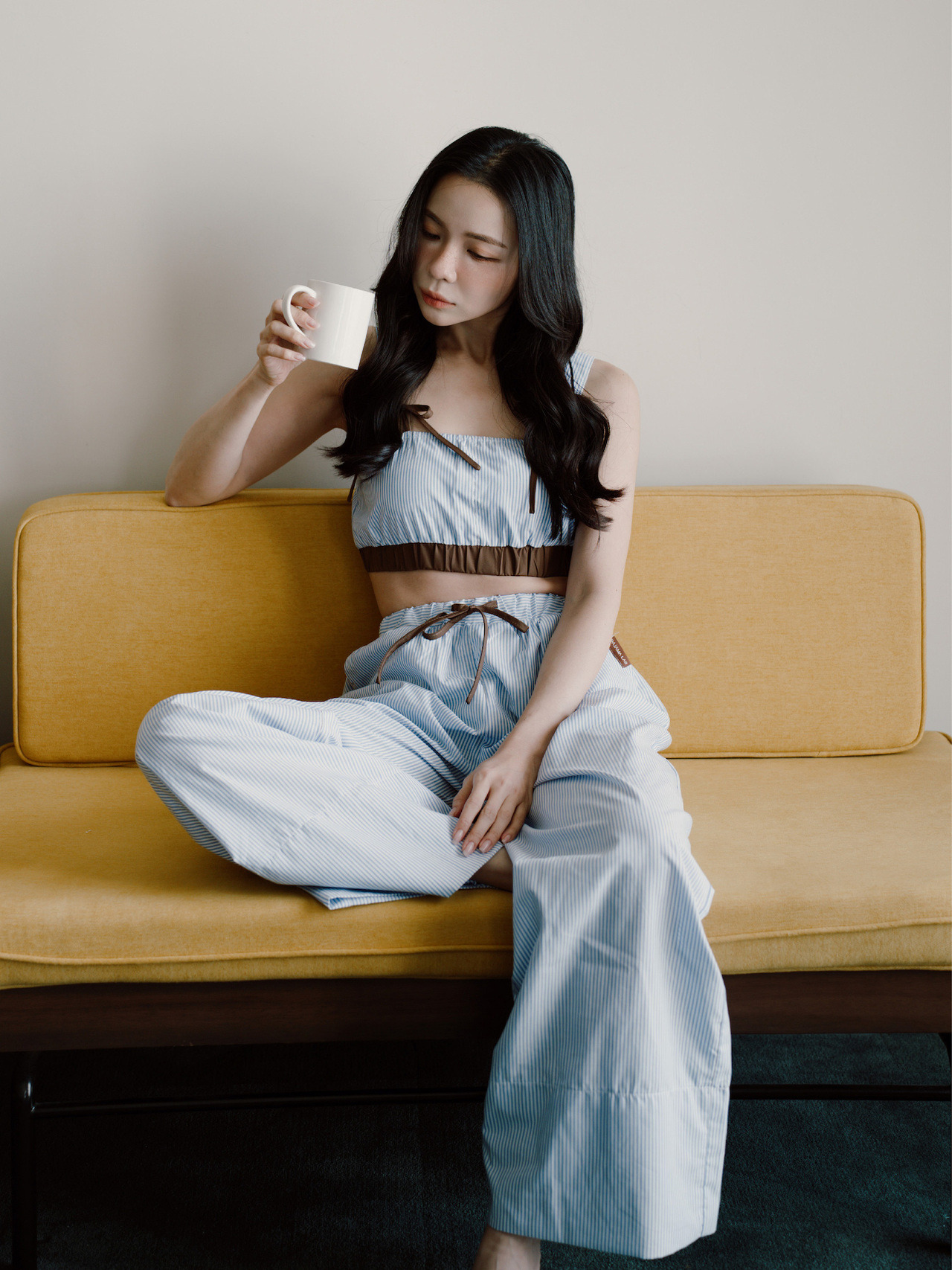 ◍ 藍白細條紋 × 咖啡色細節,復古且耐看